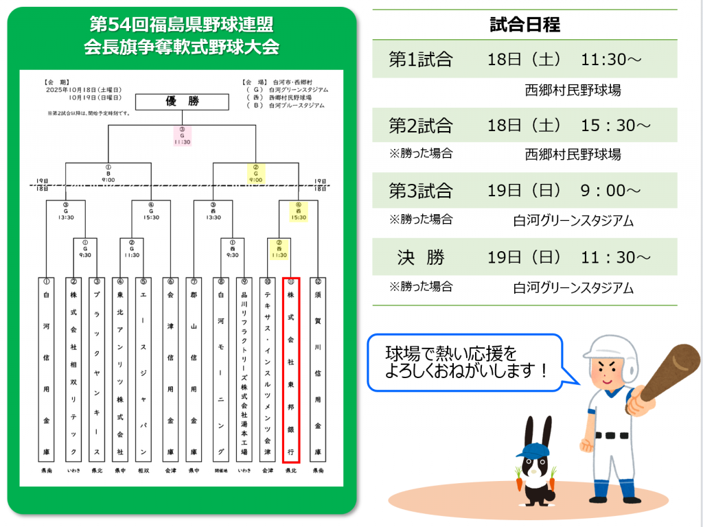「福島県野球連盟会長旗杯」が開催されます!【日程案内】 2025/10/08 10月18日(土)~19日(日)「第54回福島県野球連盟会長旗争奪軟式野球大会」が白河で開催されます。優勝目指しチーム一丸となって戦います!ぜひ球場での応援をよろしくお願いします。(詳しくは下記の組み合わせ表をご参照ください。)