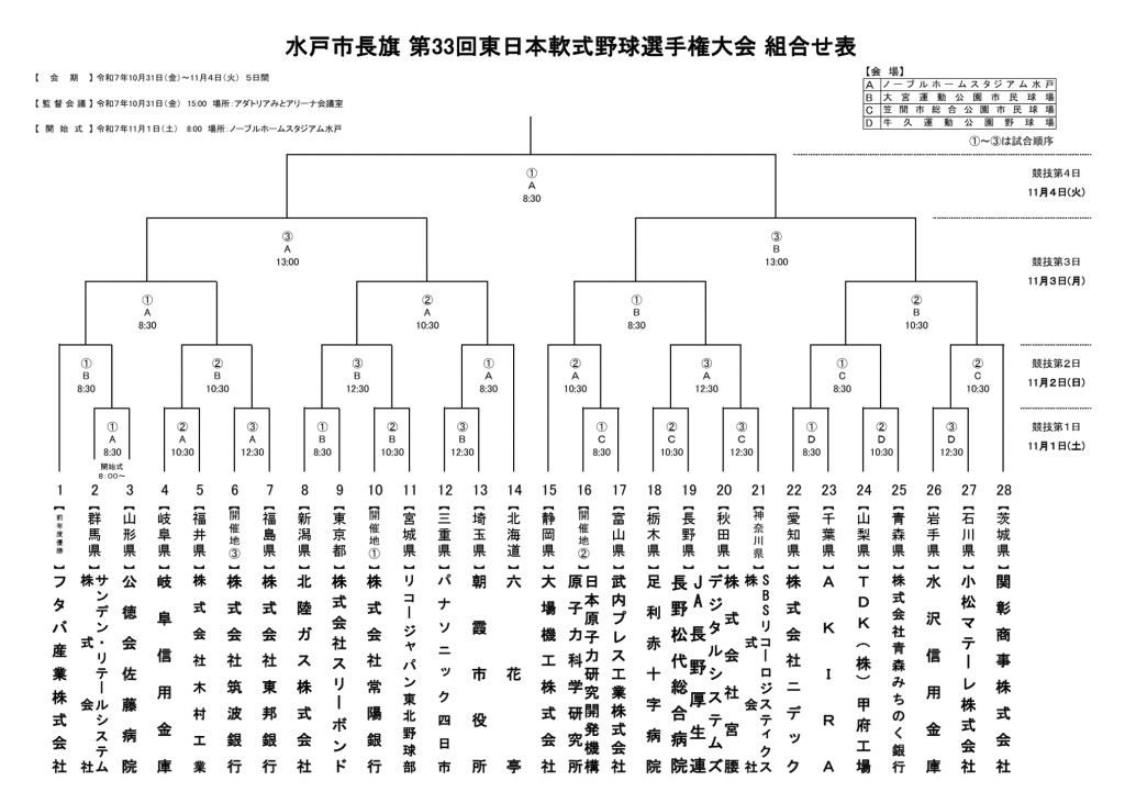 「水戸市長旗杯(本戦)」の組合せが決定しました! 2025/09/30 水戸市長旗杯の組合せが決定しました。初戦は11月1日(土)、ノーブルホームスタジアム(水戸市)にて、筑波銀行さまとの対戦となります。部員一丸となり全力を尽くしてまいりますので応援の程よろしくお願いいたします。