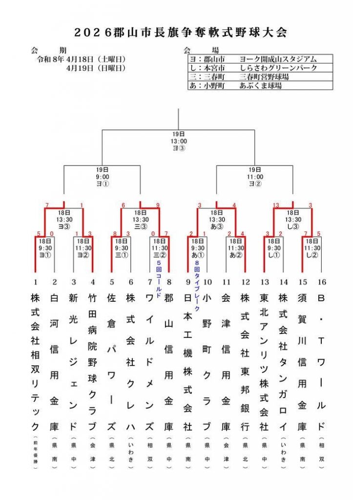「郡山市長旗争奪軟式野球大会(2026)」2回戦試合結果のお知らせ 2026/04/18 2回戦は日本工機㈱さまに4-3で勝利し、接戦を制して明日の準決勝に進出いたしました。現地でのご声援、誠にありがとうございました。優勝目指して、チーム一丸となって臨んでまいります!※準決勝の組合せは、本日19時以降、抽選により決定される見込みです(決定次第、本ホームページにてお知らせいたします)。